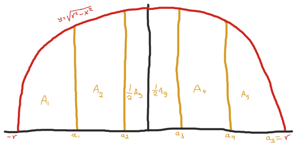 $$ \begin{equation} \sum_{j=1}^i A_j = \int_{-r}^{a_i} \sqrt{r^2 - x^2} dx \end{equation} $$Y ahora, juntando ambas definiciones de $\sum_{j=1}^i A_j$ dadas en las ecuaciones $(1)$ y $(2)$, obtenemos la siguiente igualdad: